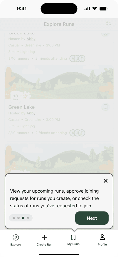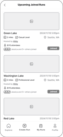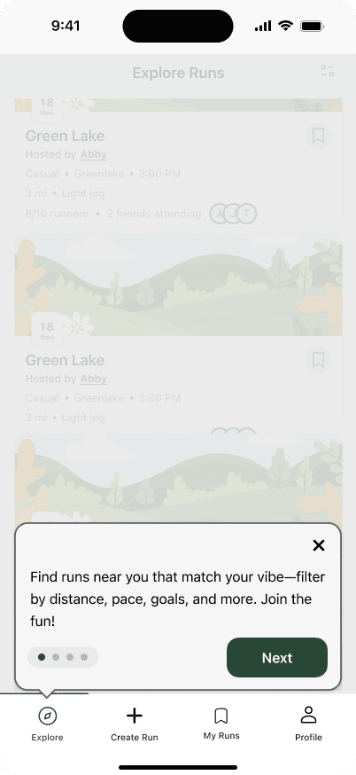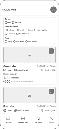 We conducted usability tests to gather feedback on our initial prototypes. Additionally, for exploring and creating runs, we A/B tested a few variations for specific areas of the screen, gathering user feedback on each. Some key changes from testing included: