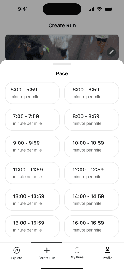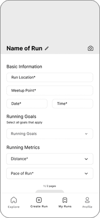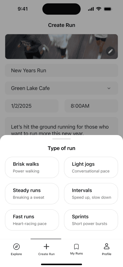 Create a run to specify details like location, pace, distance, etc., and let others join you