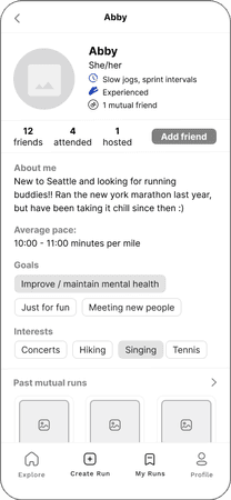 After moving to Seattle, I wanted to start running again with other people but didn't know anyone in the city yet. I also felt overwhelmed by the running club options, unsure of the right fit. Social runners should be able to easily find compatible running companions and build community.