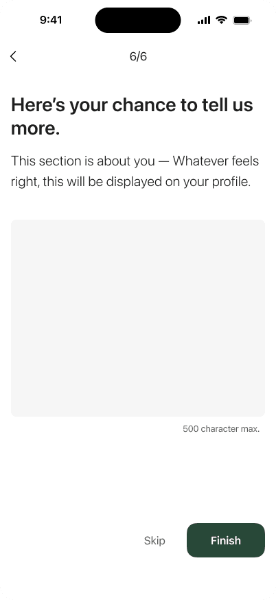 Before and after "About me" onboarding page (mid- to high-fidelity)